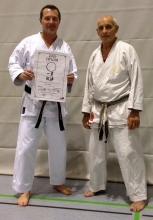 Vor den Augen der erfahrenen Prüfer, Roman Kalbacher (5. DAN) und Dr. Dietmar Wagner (5. DAN, Stilrichtungsreferent Shotokan im Karateverband Baden-Württemberg e.V. - KVBW), konnte der Offenburger Karateka bei der Prüfung in Stuttgart durch seine langjährige Erfahrung und sein Können überzeugen.