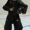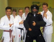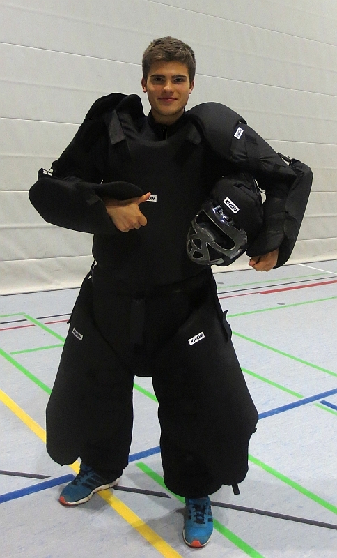 Philipp Albert, Julian Heitzmann und Karl Wiedemann zogen sich abwechselnd den gut gepolsterten Schutzanzug an. Die Jugendlichen durften sich dann (erfolgreich) gegen den schwarzen "Bösewicht" zur Wehr setzen.