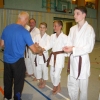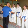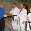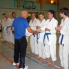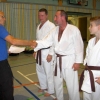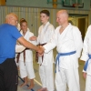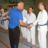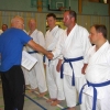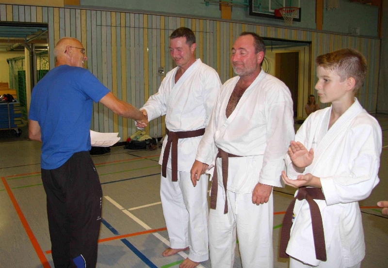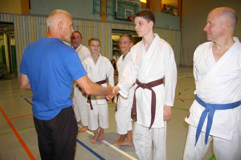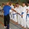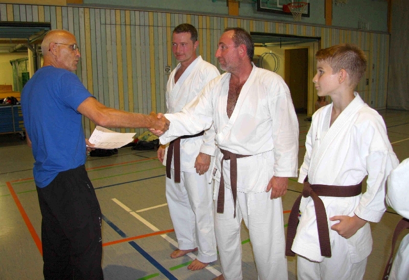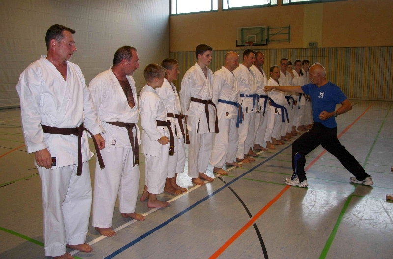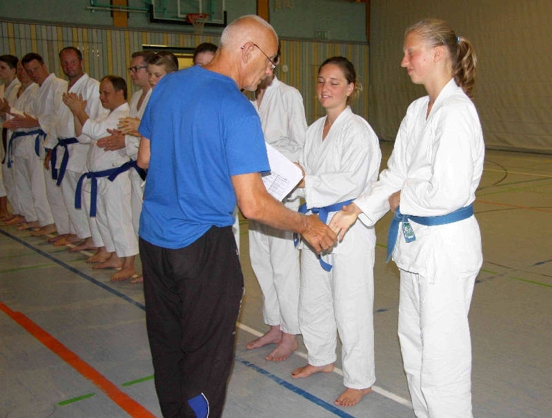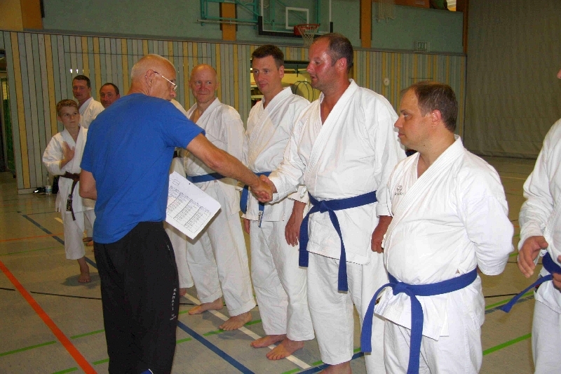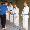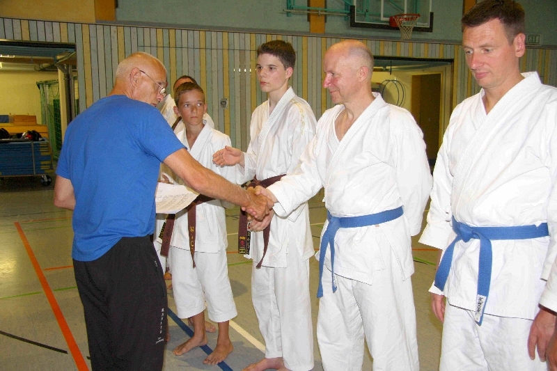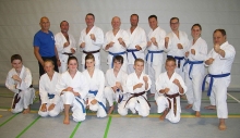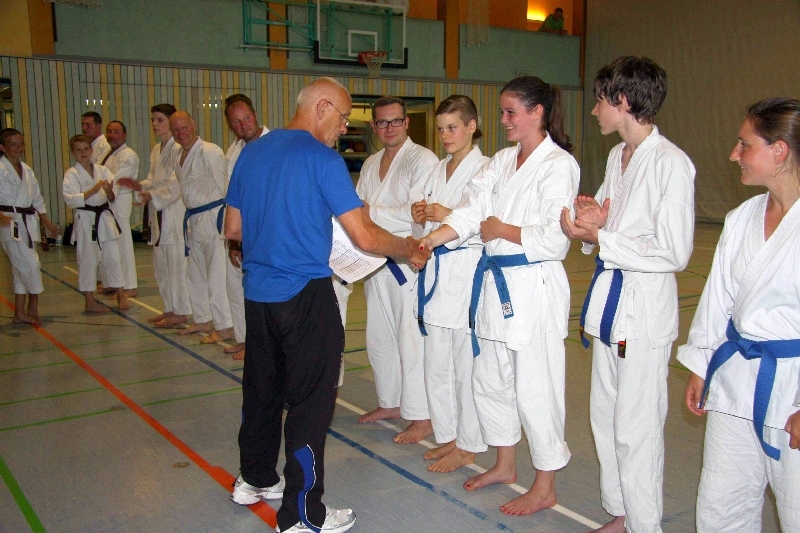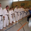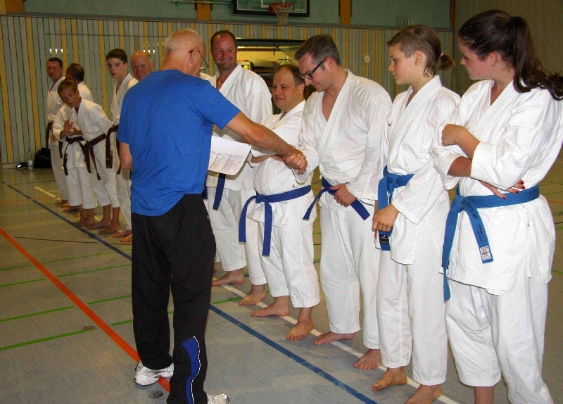 Prüfer Josef Sandhaas (4. DAN) brachte die Prüflinge ordentlich ins Schwitzen. Bei der Ausführung von zum Teil sehr anspruchsvollen Technik-Kombinationen wurde insbesondere auf wichtige Merkmale wie den bewussten Hüfteinsatz oder richtige Atemtechnik geachtet. Im Kumite (Kampf-Übungen mit Partner) bewiesen Jung und Alt ihren ausgeprägten Kampfgeist.