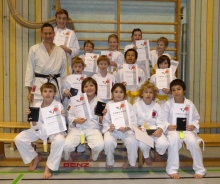 Viele strahlende Gesichter verzeichnet Jugendleiter Ralf Schneider bei seinen jungen Schützlingen. Die 14 Nachwuchs-Karatekas hatten sich in intensiven Trainingseinheiten auf das Prüfungsprogramm vorbereitet.